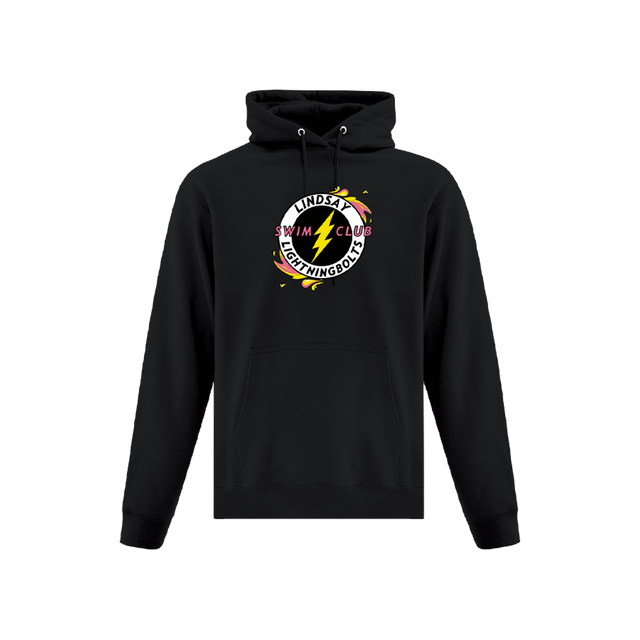 Show your team pride with these bold and cozy hoodies in black or pink. Featuring the Lindsay Swim Club Lightning Bolts logo on the front and a lightning bolt design on the back, they’re perfect for staying warm and stylish. With a unisex fit, cuffed sleeves, and adjustable drawstrings, these hoodies are a must-have for any swim club member!